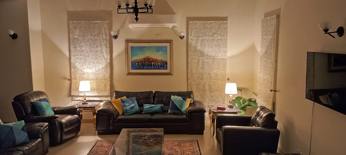Unwind and indulge in a luxury retreat offered by ComfyCozy. This modern villa is located in a lush green Bahria Enclave Islamabad . While much of the entertainment can be found within Bahria Enclave, (Birds Aviary/ Zoo) you’re just a 10 minute drive from dancing fountains @ Park View Society, the vibrant Food Valley and Rawal lake adding even more excitement to your stay. Grocery is delivered at the doorstep adding convenience. You can also get access to GYM on special discounted rates