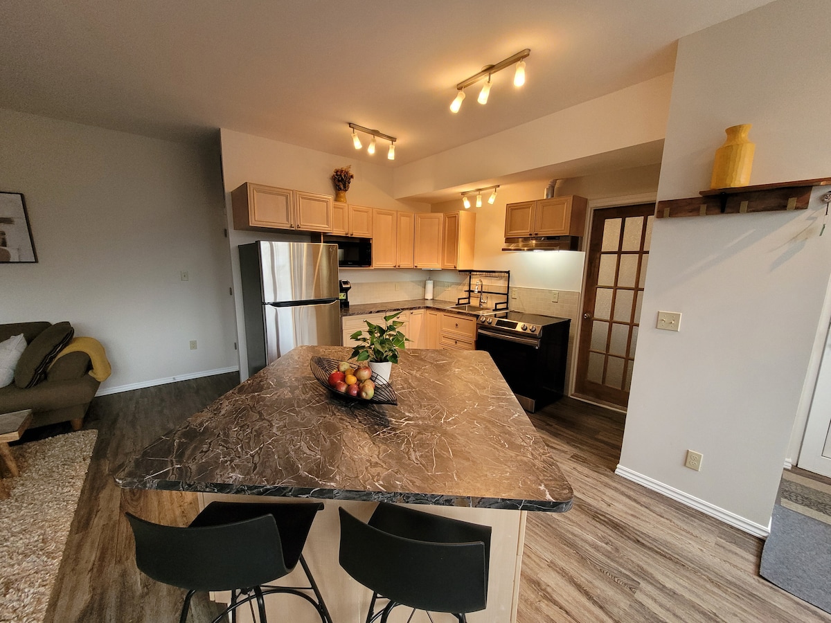 Ti diamo il benvenuto nella nostra vacanza privata. Questa spaziosa suite dispone di cucina attrezzata, bagno completo, TV a grande schermo, lavanderia e connessione Wi-Fi potente. Goditi un posto auto dedicato, la colazione continentale (latte, panna, cereali ecc.) e un cestino di prelibatezze tra cui biscotti fatti a mano! Ingresso senza chiavi per un facile check-in. La nostra posizione privilegiata ti permette di raggiungere a pochi minuti da sentieri mozzafiato, cascate mozzafiato e dal vivace villaggio del centro di Dundas. Velocità di download da Internet: 1,5 Gbps