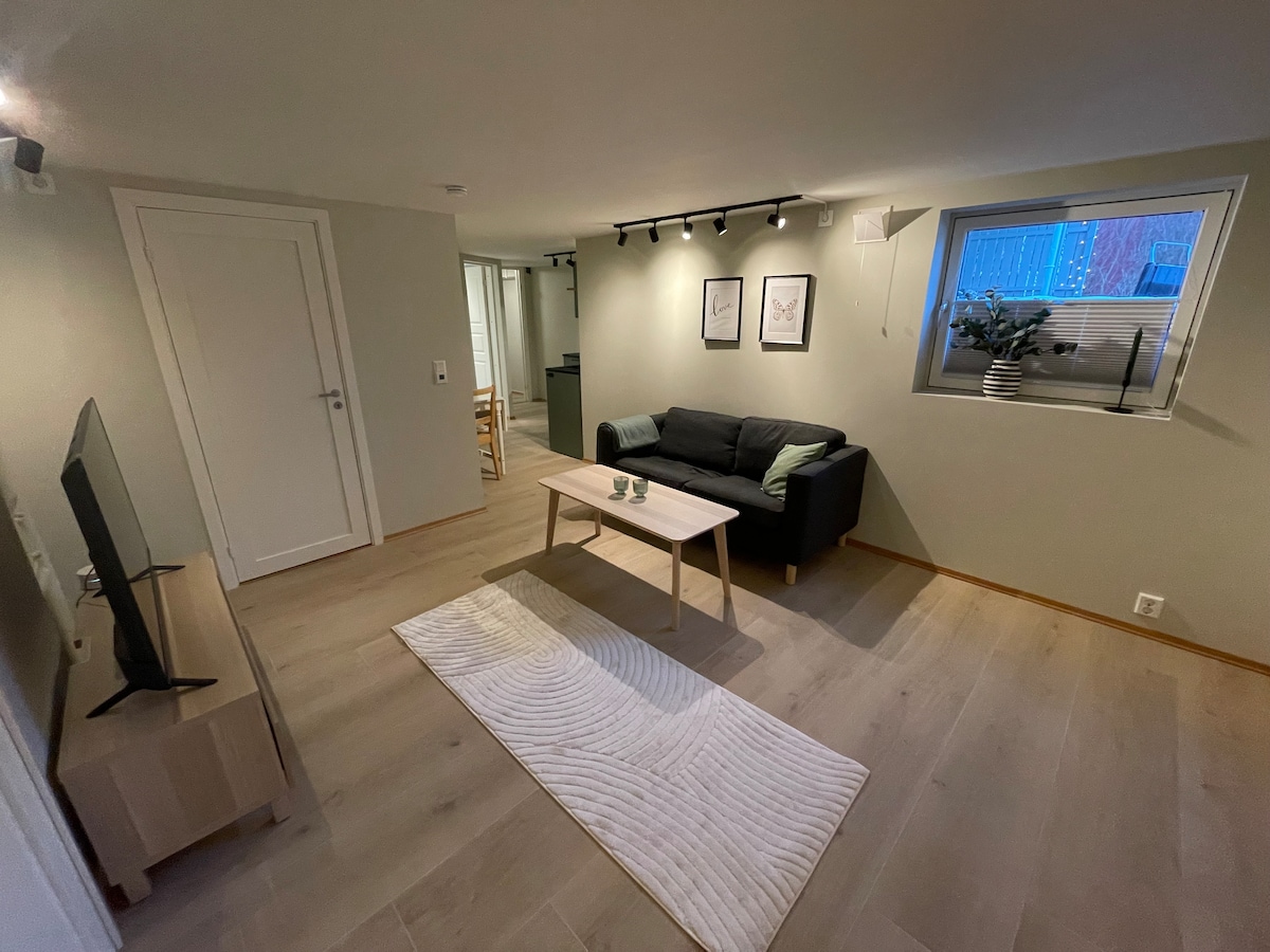 Piccolo appartamento appena ristrutturato al piano seminterrato con soggiorno, camera da letto e bagno privato. Stessa porta d'ingresso proprietaria altrimenti privata. Angolo cottura privato in salotto con angolo cottura, acqua e frigo. Bagno con servizi di lavaggio e asciugatura. Posizione centrale, a soli 13 minuti di auto dal centro di Trondheim o 1,6 km a piedi dal centro commerciale City Syd. Bymarka, a 12 minuti di auto, offre fantastiche esperienze escursionistiche sia in estate che in inverno. Buoni collegamenti bus. Possibilità di parcheggio nel vialetto.