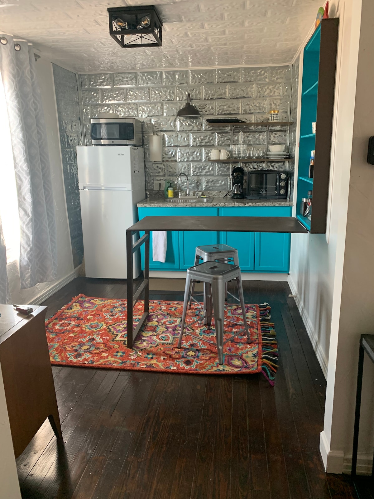 From the 1940’s this building is one of the few remaining original second story residences built over a 1st story business. Downtown, this suite is walkable: coffee shops, bars, restaurants, art galleries, yoga studio. 2 blocks to Shannon Medical Center. 1 block to Performing Arts Center. 350sf for 1 or 2 people. Includes a queen bed, full bath, fridge, microwave, toaster oven. Open concept with lots of light. No living room/seating area but perfect if you're on a budget and on the go!