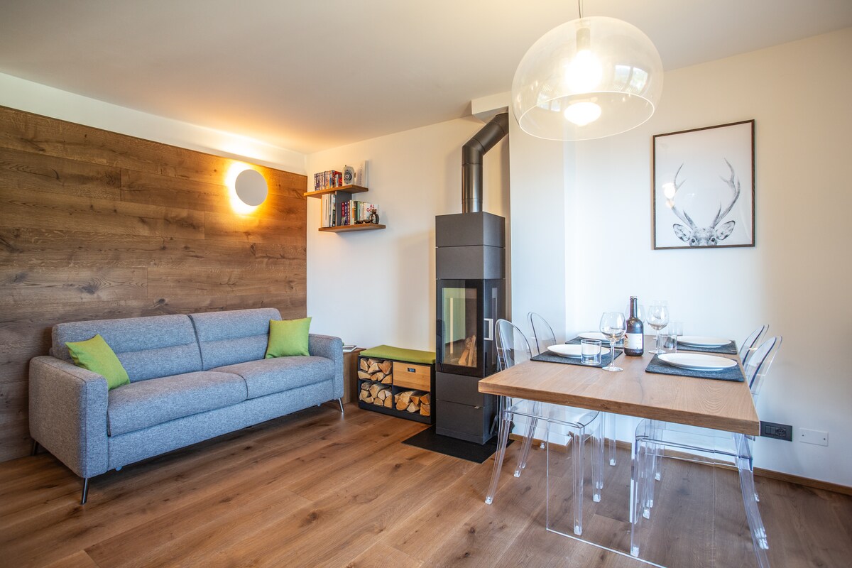 L'alloggio è situato in pieno centro ed è appena stato rimodernato con lo scopo di soddisfare ogni richiesta da parte degli ospiti. A poche decine di metri si trovano gli impianti sciistici nella stagione invernale e il centro pedonale, il lago e il campo da golf durante il periodo estivo. L'alloggio è dotato inoltre di posto auto privato coperto, ampio balcone, giardino comune con solarium e servizio di portineria.
