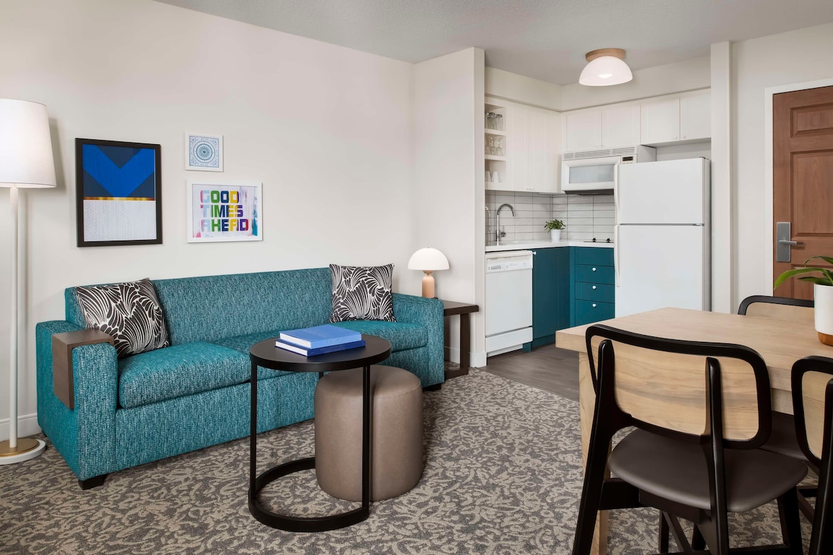 The rooms at Nester Entertainment District are designed for comfort, convenience, and modern city living. Large windows fill each space with natural light, creating bright, welcoming interiors throughout the hotel. Every room includes Roku streaming, a dedicated workspace, and in-unit coffee and tea, making it easy to settle in whether you’re here for a quick getaway or a longer stay. This is our standard queen room, with 1 Queen bed.