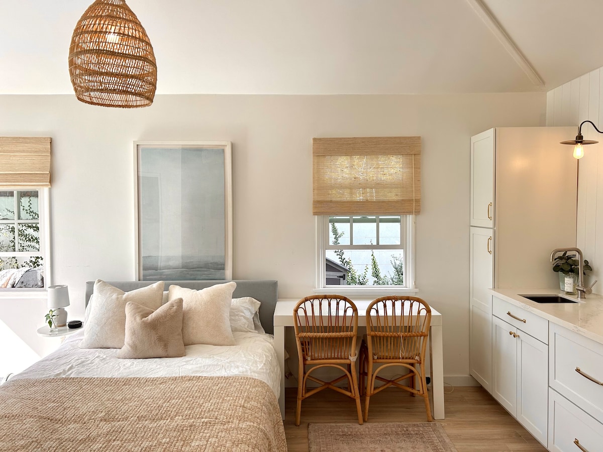 This is a comfy little studio attached to the main front property. You would have complete privacy with a private entrance and self-check in. The studio has a standard queen size bed (60x80in), bathroom, closet space, small dining table & a desk/office space. There is not a full kitchen, but the room has a mini fridge, microwave & k-cap machine. -Good for business travelers & solo adventurers -Free parking available on the premises