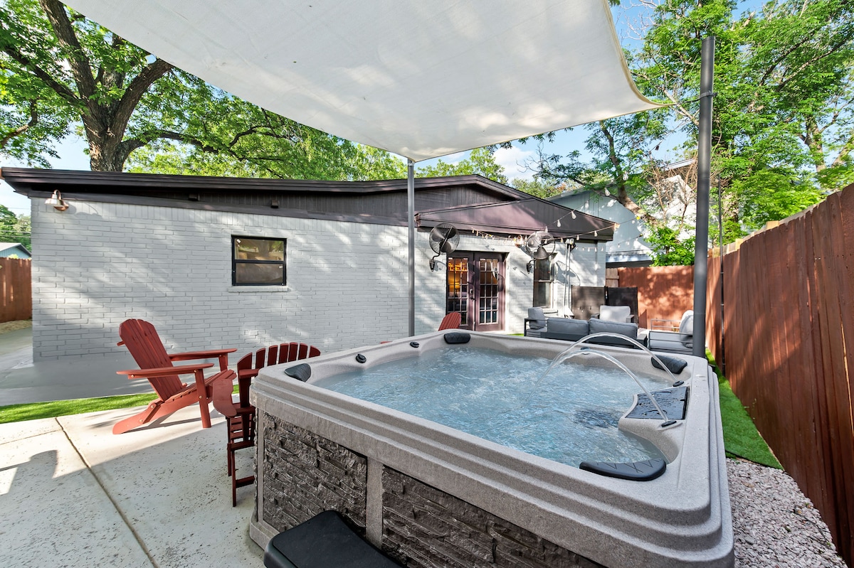 Ti diamo il benvenuto nella nostra oasi di South Austin, perfetta per addii al nubilato, riunioni di famiglia o vacanze di gruppo! Questa casa recentemente ristrutturata si trova a pochi minuti da South Congress, Zilker Park e dai migliori ristoranti e locali notturni di Austin. Rilassati nella vasca idromassaggio privata, nella sauna o nella piscina a temperatura controllata di 3 metri, abbastanza grande per 8 adulti. L'oasi del cortile include ventilatori, griglie, comodi posti a sedere e una Peloton, un vogatore e pesi liberi. All'interno, la cucina a vista e il design moderno rendono questo alloggio il rifugio perfetto ad Austin.