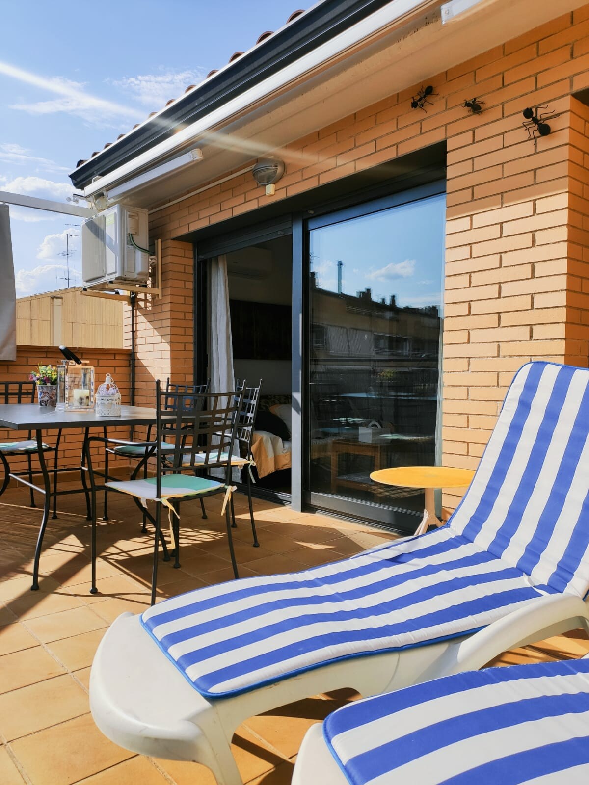 Ático dúplex con buenas vistas a la montaña de tres habitaciones :una de matrimonio, una doble y una individual; cocina equipada , comedor , dos baños con ducha , un aseo, gran terraza de 25m2 con tumbonas . Hay calefacción , ventiladores de techo en las habitaciones ,aire acondicionado en la primera planta y dos smarts TV (comedor y habitación de matrimonio ). Trastero para motos y bicis en el mismo edificio con un suplemento de 5€por bici y día con cuatro tomas de conexión eléctrica .
