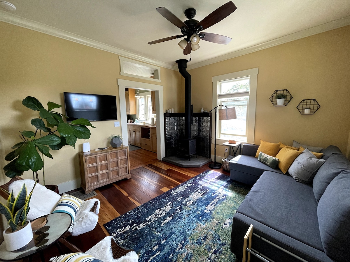 Perfect for two guests and a dog, this private one-bedroom home sits directly on the Hammond Trail in McKinleyville, CA. Walk or bike to the Mad River and ocean right from the property, with easy drives to beaches and redwood forests. Enjoy gated, secure parking, fully fenced yards, a comfy queen bed, sleeper sofa, fully equipped kitchen, plus an outdoor sauna and shower. Guests typically enjoy the garden and sunsets as well as the cleanliness and peace that the space exudes.