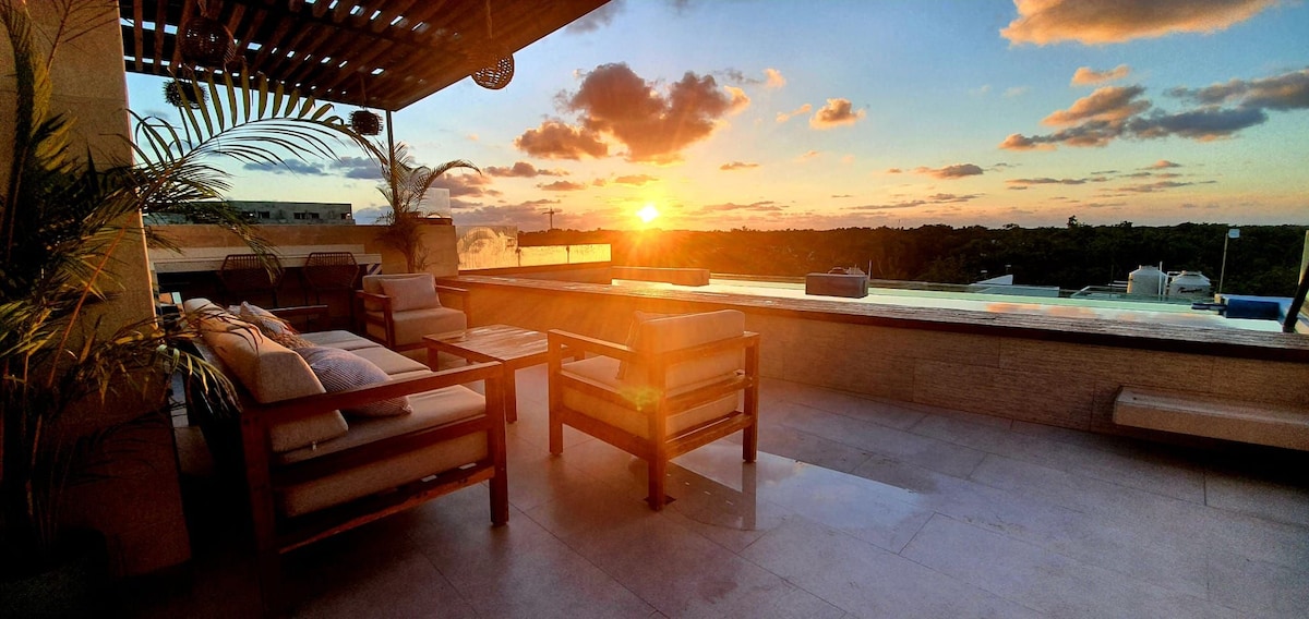 Stunning loft apartment with direct access to pools, near Tulum center and only a few minutes from the spectacular beach and Tulum beach clubs. Enjoy several stunning swimming pools, a roof top pool, sun beds, nice gym, 24/7 staff, strong A/C, elevator, fast Wifi (400 Mbps), blackout curtains, 55" smart TV, a fully equipped kitchen and private parking. Experience outdoor dining or just drinks with beautiful panoramic views at the roof top restaurant