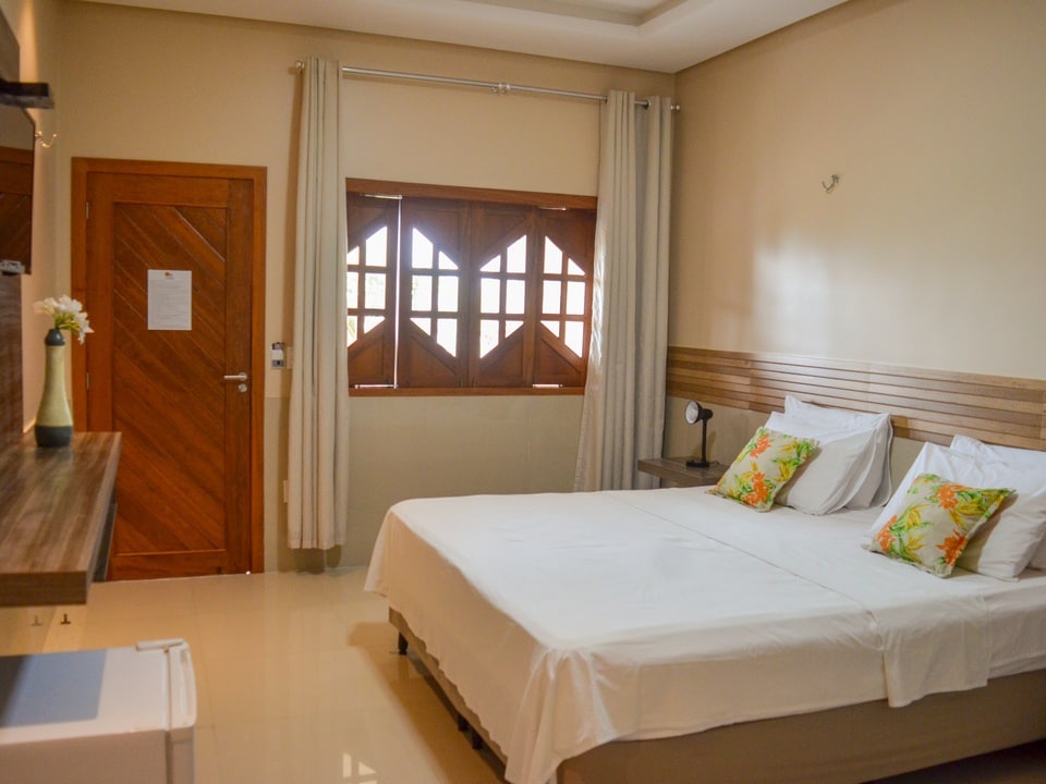 Standard Grande Mar Família (Quíntuplo) Acomodação ampla com Cama King Size e 3 camas de solteiro. Equipada com Ar Split, TV LED 32", frigobar e secador de cabelo. Banheiro privativo com moderna ducha de aquecimento solar. Conforto e praticidade para sua viagem em grupo ou família.