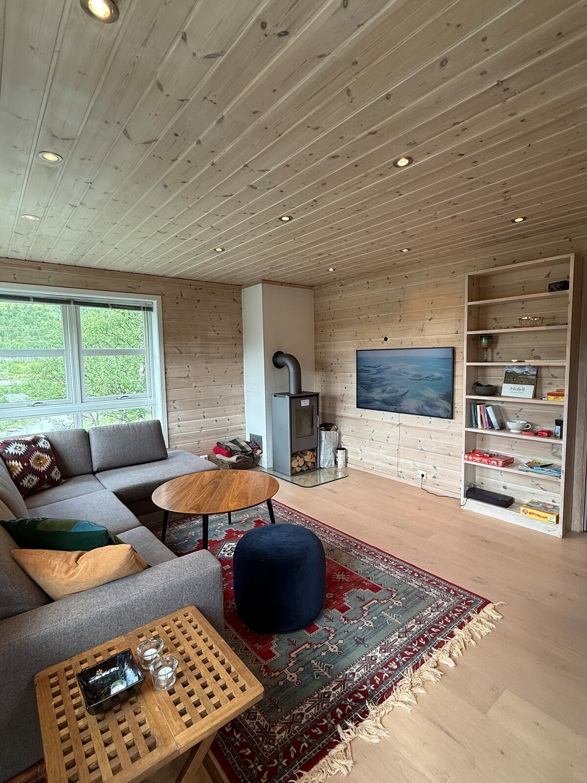 Immagina di svegliarti nella baita più accogliente del mondo con la natura a portata di mano. Le grandi finestre ti rendono altrettanto fuori, quando sei dentro. Il miglior fiume di pesca norvegese scorre così vicino che puoi praticamente pescare dal portico. Durante l'estate, vedrai il rimbalzo delle trote. In inverno il fiume è come un'opera d'arte della neve e del ghiaccio