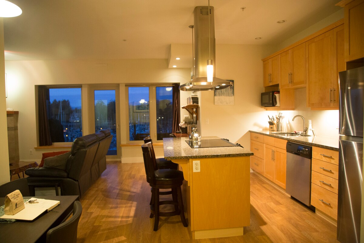 The Moorage, Ucluelet IG @bluecrushrentals Un luminoso appartamento con 2 camere da letto. L'appartamento si affaccia sul porto turistico di Ucluelet, nel centro della città. Ampio balcone con barbecue, camera da letto principale con testiera in legno di ciliegio dal bordo vivo fatta a mano, seconda camera da letto con set unico in legno e metallo fatto a mano, tavolo da cucina dal bordo vivo e panca, tutto questo rende questa casa base splendida. Il soggiorno offre una splendida vista sul porto turistico con un accogliente camino e l'accesso al patio per guardare l'azione della barca.