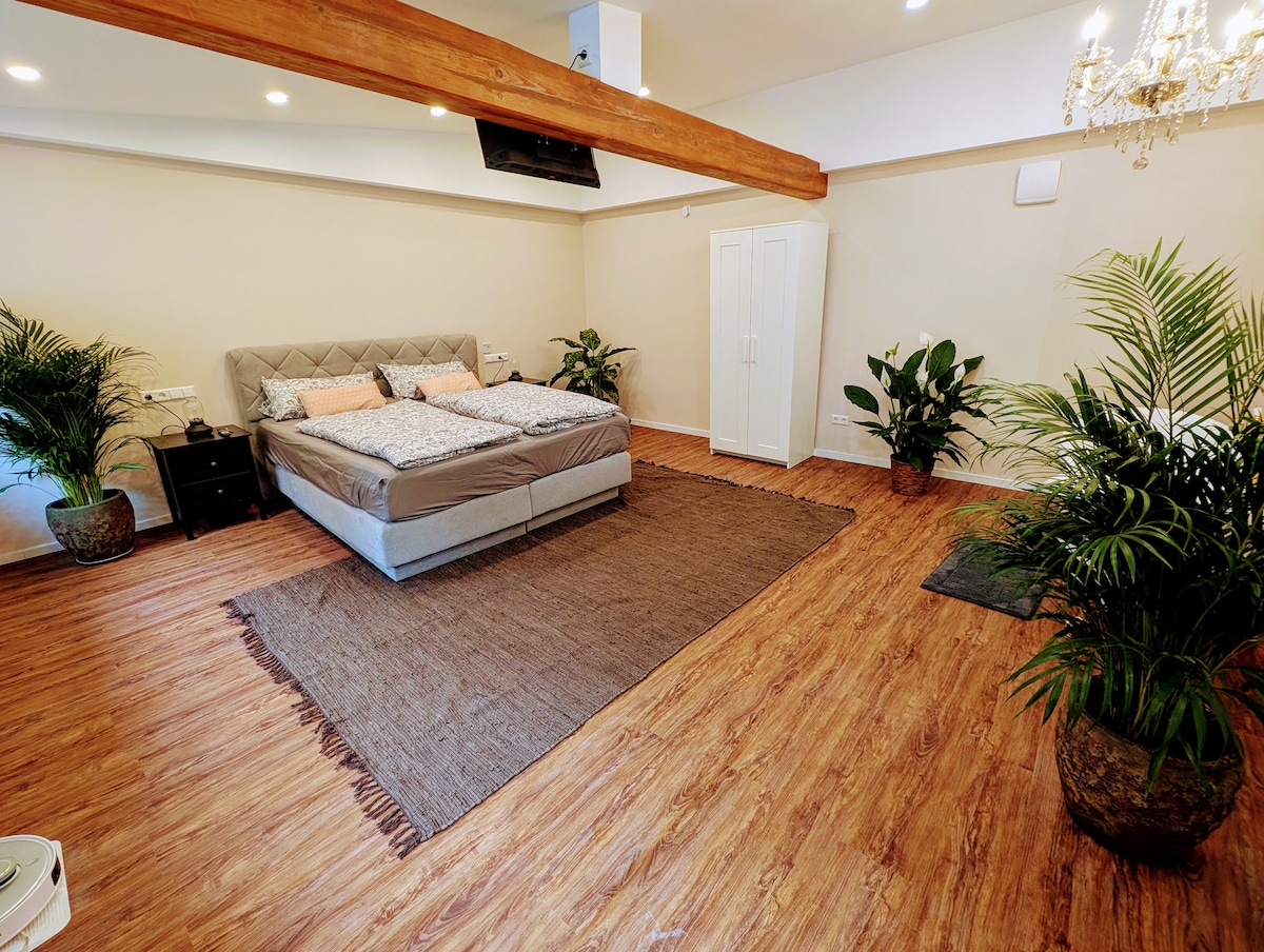 Il nostro bellissimo e accogliente appartamento è ben servito dai mezzi pubblici, a 10-15 minuti a piedi dal centro città, dai negozi, dall'arte e dalla cultura o dalla natura (parchi/fiume). L'appartamento è luminoso e sembra molto arioso grazie all'alta struttura del tetto a vista. L'alloggio dispone di un letto comodo, di un accogliente soggiorno e di una cucina completamente attrezzata. L'appartamento è adatto a coppie, piccoli gruppi/famiglie e a chi viaggia per lavoro.