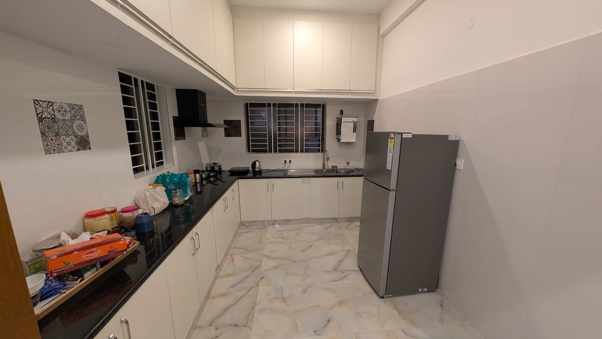 Situato nel cuore di Bangalore, questo spazioso e moderno appartamento con 3 camere da letto è perfetto per famiglie o gruppi, fino a 6 persone. Ogni camera dispone di un comodo letto matrimoniale con lenzuola di alta qualità e materassi in schiuma. L'ampio soggiorno comprende una Smart TV da 50 pollici, un tavolo da pranzo a 6 posti e un accogliente divano, e il balcone con tavolo da tè e sedie offre abbondante luce naturale.