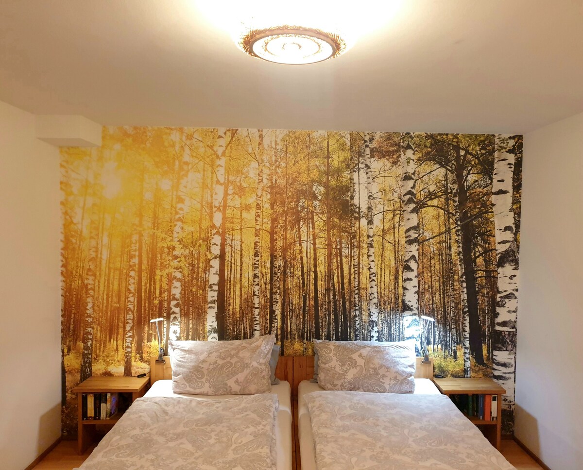 Nuovo appartamento elegante con ampio letto matrimoniale (180 x 200 cm), dotato di una carta da parati fotografica Mandala 3 D, vi invita al mix perfetto di viaggio in città e Foresta Nera. Caffè e tè inclusi. A un minuto di distanza si trova una deliziosa colazione al Kaiser Loft. Il famoso quartiere ecologico di Friburgo Vauban è raggiungibile a piedi in 2 minuti. La stazione centrale di Friburgo è raggiungibile in auto in 10 minuti e con i mezzi pubblici in 15 minuti.