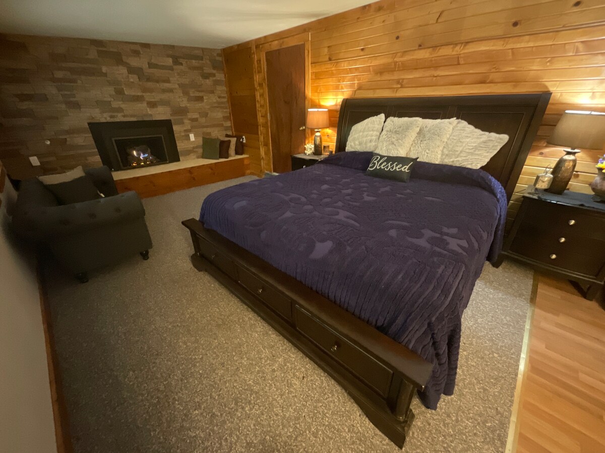 Chalet con 3 camere da letto (6 posti letto) nascosto tra i boschi vicino all'area ricreativa del Monte Emily (1496 ettari di attività ricreative e chilometri di sentieri gratuiti), a pochi minuti dalla città. Goditi escursioni a piedi, in bicicletta e sugli sci proprio davanti alla porta di ingresso. Organizza una cena nella grande cucina o cucina sul barbecue sotto la terrazza coperta mentre i tuoi cani giocano nel cortile recintato. Termina la giornata accanto alla stufa a legna mentre i bambini si godono un film nella stanza con letti a castello. Spazio di lavoro dedicato e connessione internet Starlink molto veloce in loco.