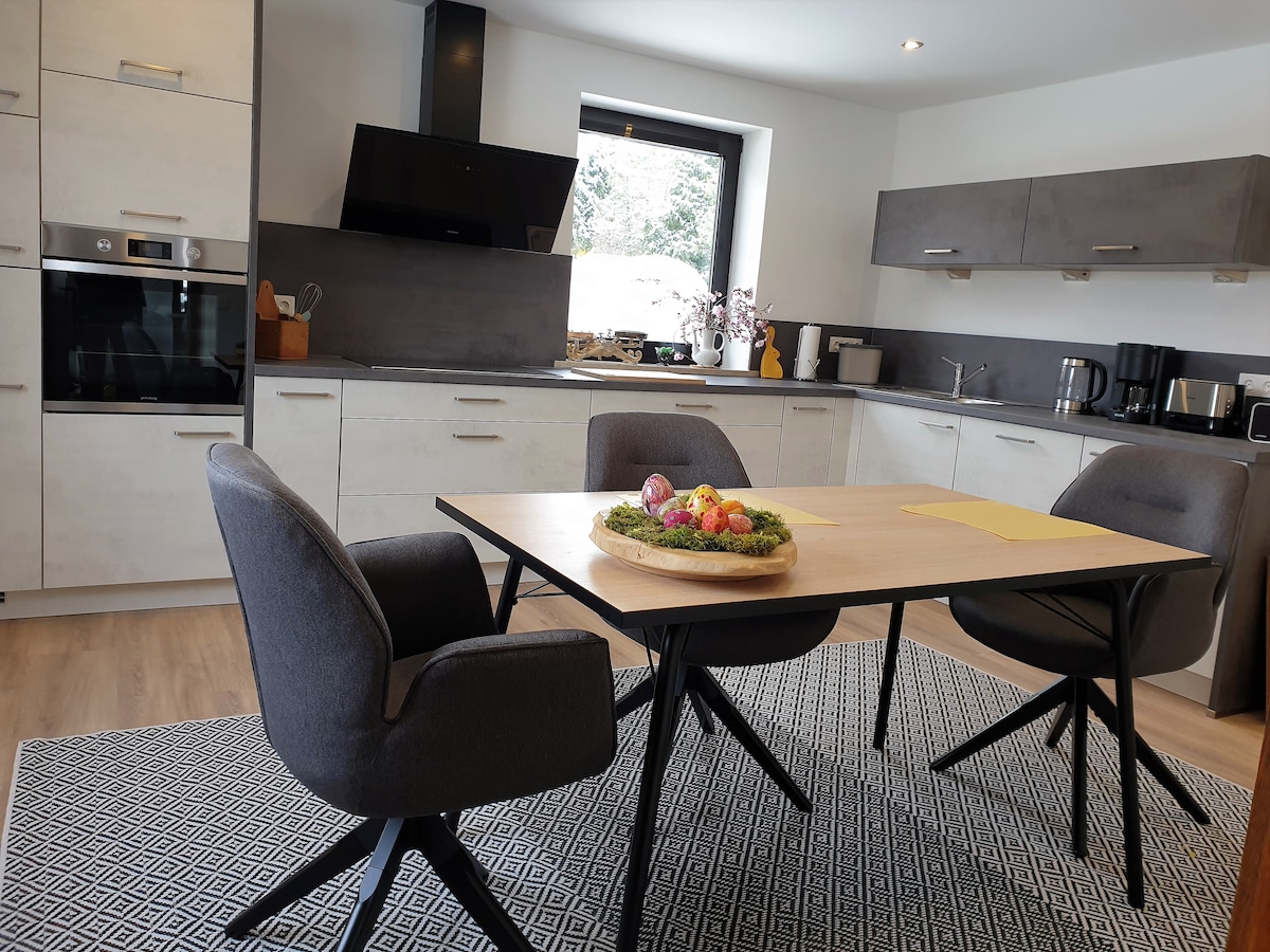 Questo bellissimo appartamento con 2 camere da letto si trova al piano terra della nostra casa. Il parcheggio gratuito si trova proprio davanti alla terrazza dell'appartamento. L'ingresso indipendente senza barriere è esclusivamente per l'appartamento e i suoi abitanti. Per soggiorni più lunghi è possibile fornire una lavatrice.