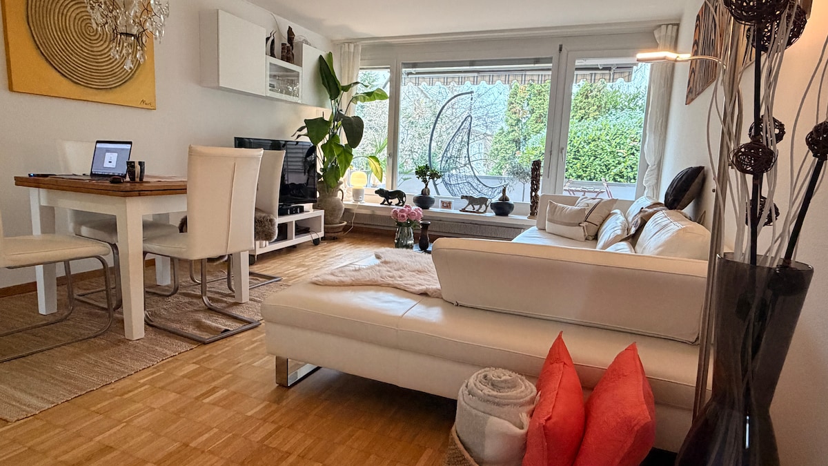 Rilassati con il tuo partner o la tua famiglia in questo luogo tranquillo. È un piccolo paradiso vicino ai margini della foresta/ruscello nel verde e tranquillo quartiere di case unifamiliari. L'appartamento di 2,5 camere è situato in un bungalow con fascino anni '80. La casa ha un vialetto ed è quindi lontana dalla strada, che viene utilizzata solo dai residenti. A volte cervi, scoiattoli e altri animali selvatici possono essere osservati di estate. Ci sono due zone salotto con giardino. La casa dista solo 20 minuti in auto dalla città di Zurigo.