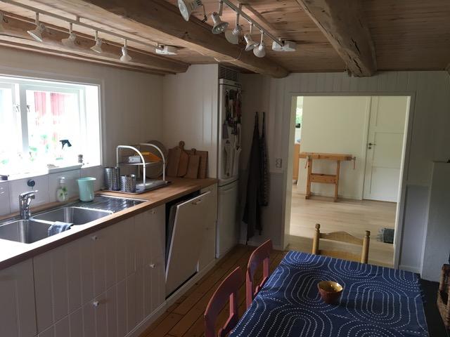 Casa estiva fresca con soffitti alti, camino, cucina e soggiorno con pianta aperta, lavastoviglie. 2 camere da letto, letto matrimoniale in una, letto a castello più letto singolo nell'altra, 5 posti letto. Bagno con doccia separata (non WC) e lavatrice. Terreno naturale, grande prato con tappeto elastico. Terrazza in legno con posti a sedere e un comodo divano ad angolo, barbecue a carbone disponibile. A circa 7 minuti a piedi da una bella baia con scogliere, spiaggia di sabbia, pontile, zattera con trampolino e un piccolo parco giochi con scivolo per i più piccoli.