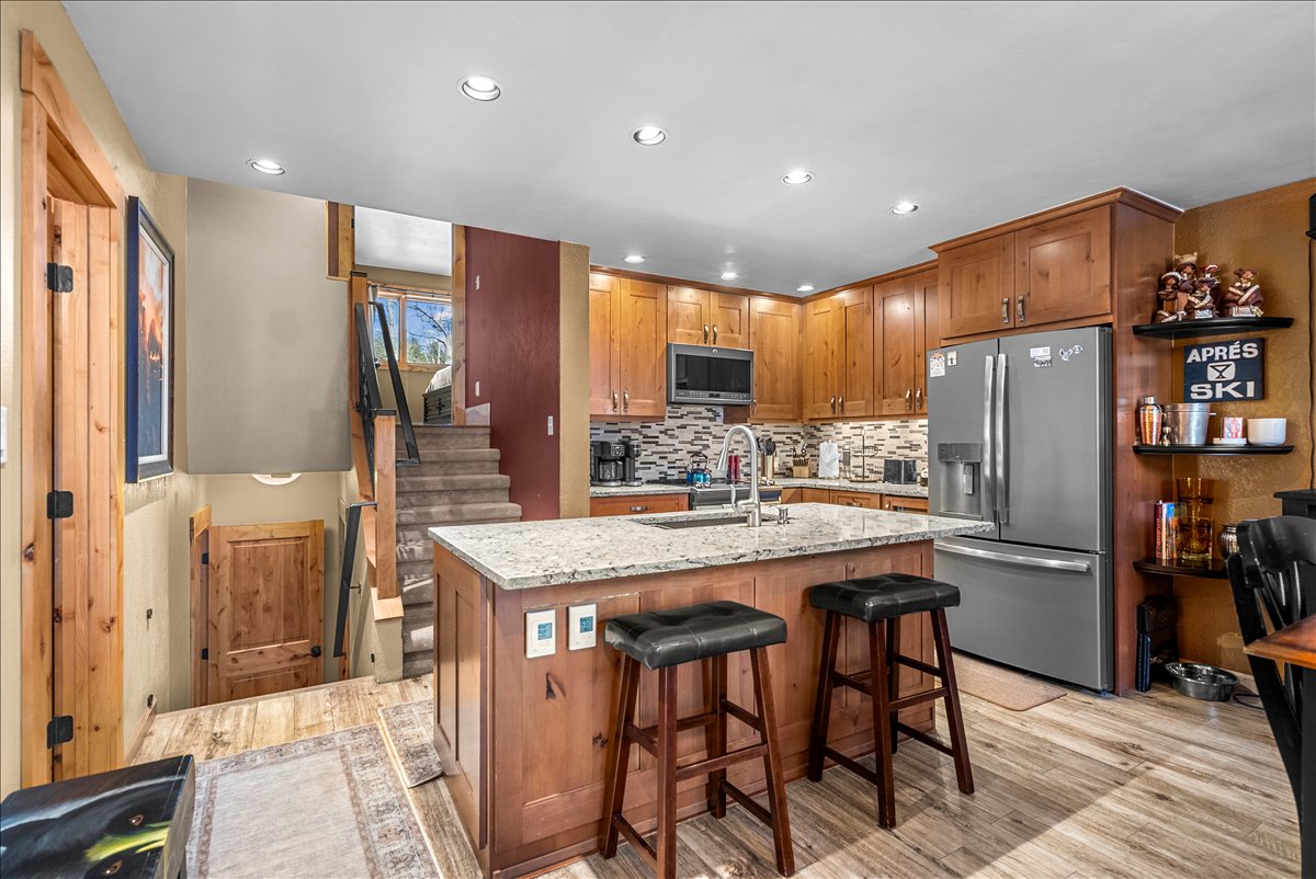Main Street convenience meets mountain adventure! At our condo your <1 minute walk to the free Summit Stage Ski bus and also to charming Frisco Main Street for restaurants, coffee and shopping. Aprés-ski finds its perfect setting back at the condo, with two cozy bedrooms, dual headed master shower, blackout curtains, newly remodeled kitchen, wood burning fireplace, sunken living room framed by mountain vistas, private, ground level back porch w seating, washer/dryer, 2 dedicated parking spots