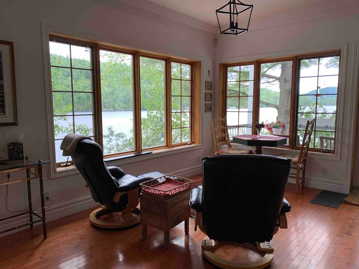 Questa proprietà unica si trova proprio accanto al lago, con acqua su 23 lati della terrazza coperta. Accogliente, romantico, con viste mozzafiato e tramonti incredibili rivolti a sud, quindi sole tutto il giorno. Camera da letto con porta patio da 8'che si affaccia sul lago e sulla tua terrazza privata coperta. Vasca idromassaggio, a 15 passi di distanza. Il piano principale ha una cucina completa, due zone pranzo una con vista sul lago. I cani (silenziosi e non aggressivi) sono i benvenuti. CITQ #298403