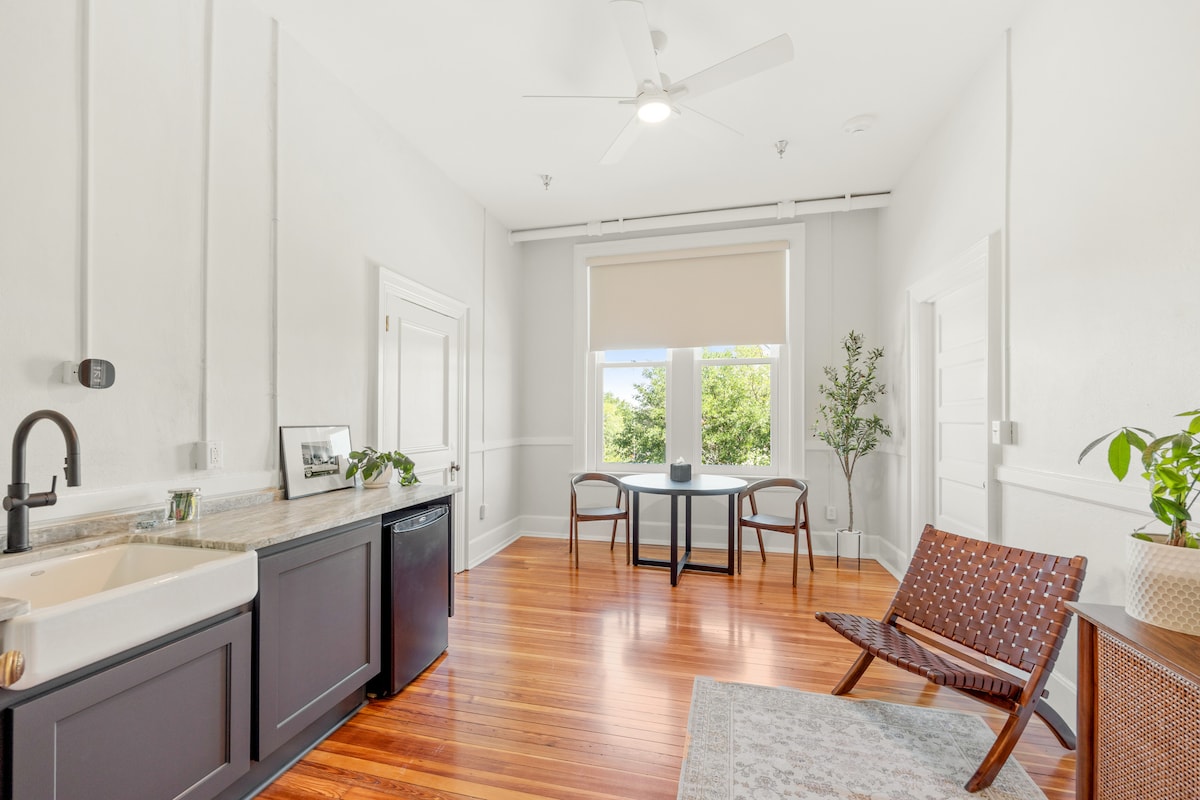 Il Book & Table Inn si trova in un edificio restaurato del 1890 nel centro gentrificato di Valdosta, in Georgia, all'angolo tra Patterson e lo storico Bennie' s Alley, il luogo più fotografato della Georgia del Sud. La September Room è la nostra stanza più grande dell'Inn con una finestra e una porta che si aprono sul cortile. Il soffitto di 3 metri fa sembrare la stanza ancora più grande. C'è un ampio armadio con un tavolo pieghevole per fornire uno spazio di lavoro.