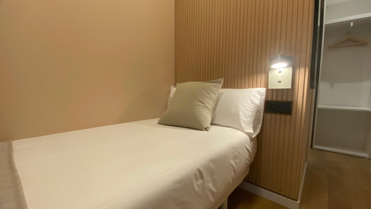 Condizioni e servizi della camera: --> Letto matrimoniale indivisibile, (due cuscini e una coperta). --> Bagno singolo con doccia, lavandino, bagnoschiuma, sapone per le mani, asciugamani. -> I servizi igienici sono nel corridoio, di fronte alle stanze e sono condivisi. Separato tra uomini e donne. --> FUMO LIBERO: non è permesso fumare all'interno della stanza -> Non c'è una finestra verso l'esterno nella stanza. (Luce artificiale) .