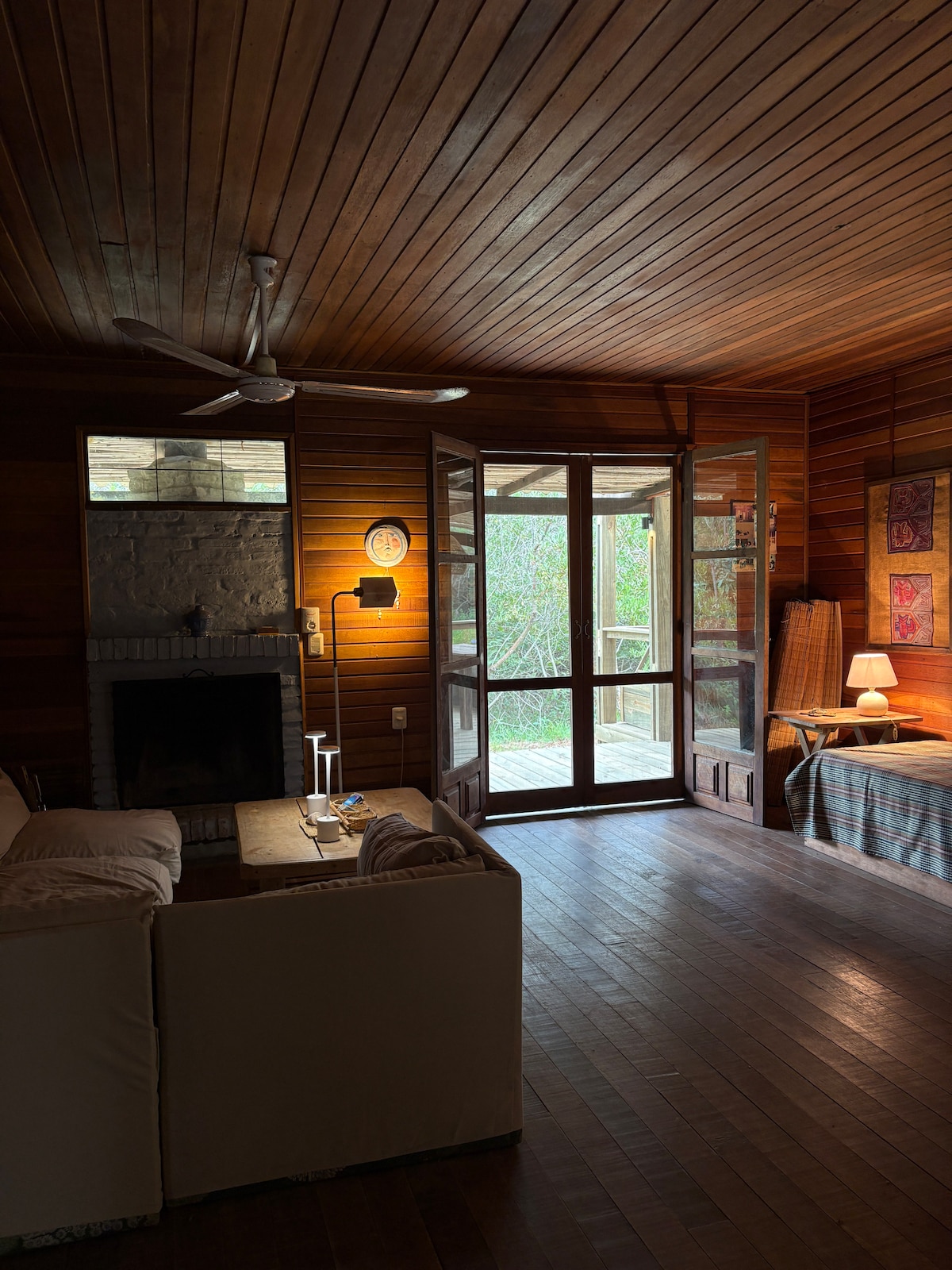 Casita en el bosque a menos de 10 minutos de la playa, con amplio ventanal que apunta al bosque, consta de una cocina/sala, bano, un cuarto de dormir con una cama doble y una cama pequeña. El alojamiento es ideal para desconectar de la cotidianidad y vivir en contacto con la naturaleza, rodeado por bosques de pinos y acacias. El ruido del océano y un cielo estrellado acompañan las noches de los huéspedes. Tenemos unos gatitos que andan en la vuelta.