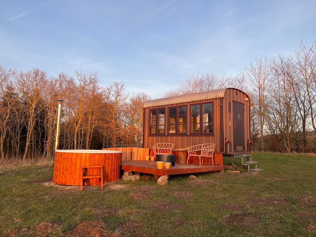 Scopri gli incantevoli dintorni di questa romantica casa nella natura. In cima al monte, si affaccia su Nørreådalen, dove i campi e i boschi sono indisturbati e dove Nørreåen scorre tranquillamente. C'è un vecchio vagone decorato con un letto, una piccola cucina e una splendida vista, per l'intera parete di fronte a Nørreådalen, è una grande sezione finestra. Goditi una bottiglia di spumante in terrazza o nel tuo bagno nella natura selvaggia. La vista è a ovest, il che significa che ogni sera c'è il tramonto più bello.