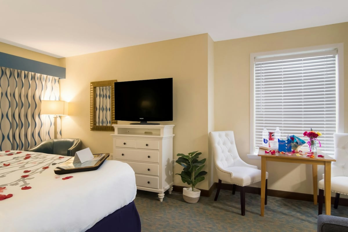 Scopri The Pelican Room presso l'Haley's Court Boutique Motel a Vilano Beach, in Florida. Questa incantevole camera dispone di un accogliente letto matrimoniale grande, tende oscuranti e un angolo cottura con caffè locale, mini-frigorifero e forno a microonde. Goditi una smart TV e un set di cortesia per una maggiore comodità. Combinando la nostalgia vintage con i comfort moderni, la Pelican Room offre un soggiorno senza intoppi con check-in senza contatto. A pochi isolati dalla spiaggia e vicino al centro di St. Augustine, è l'ideale per esplorare.