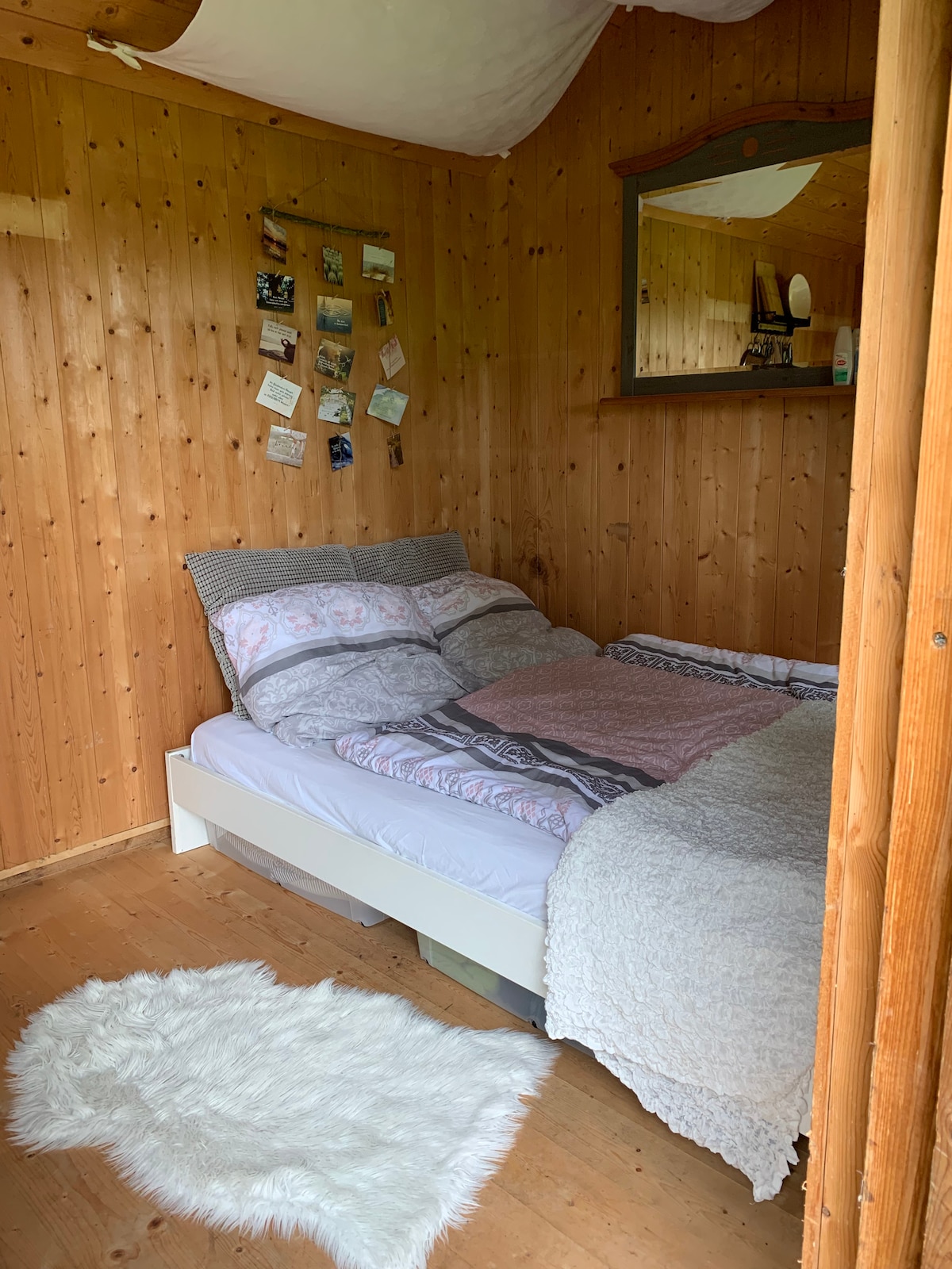 Vieni in questo rifugio incomparabile immerso nella natura. Offriamo una piccola casa di legno tra i nostri 2 stagni, su uno dei quali si trova una piccola barca a remi. Nel cottage c'è un comodo letto matrimoniale, una zona salotto e la possibilità di cucinare con un fornello da campeggio - ma non c'è elettricità né acqua corrente nel cottage. Vicino alla casetta c'è un piccolo lavabo. All'aperto c'è una zona barbecue, un'amaca e posti a sedere. Il bagno ad uso esclusivo si trova nella parte superiore della fattoria.