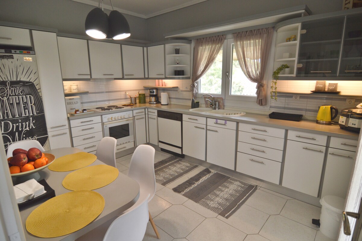 Rilassati e vivi la vita di campagna in una casa elegante circondata da campi, godendoti una vista ininterrotta sul Monte Olimpo. Scoprite i luoghi di interesse nelle vicinanze, siano essi naturali, storici o culturali, o fate una pausa nella piazza del paese sotto il grande platano, godendovi ogni momento mentre il campanile suona l'ora in sottofondo. Hai bisogno di un cambio di ritmo? A soli cinque minuti di auto da Kozani. Scopri un luogo dove le stagioni si alternano ancora, senza sentirti isolato o rinunciare al comfort.