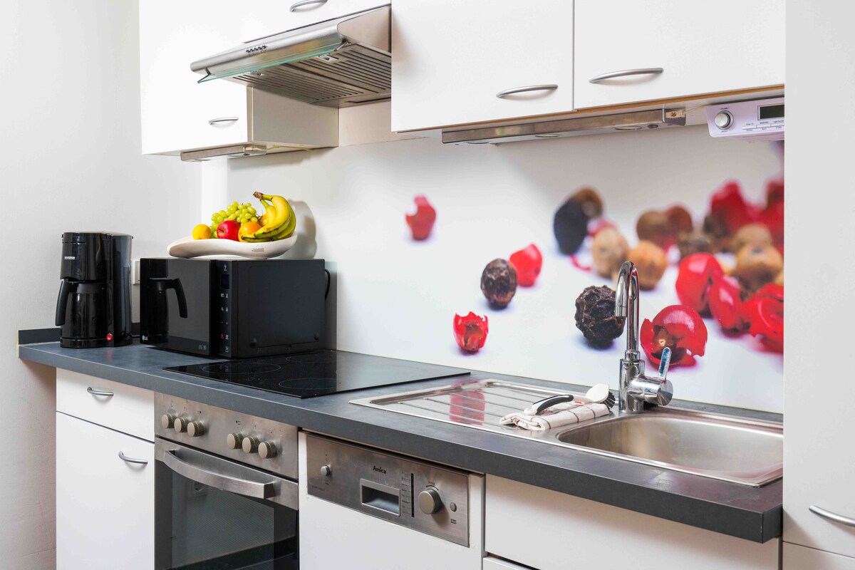 L'appartamento è situato in posizione centrale ma tranquilla a Volkach. È composto da un soggiorno, una cucina completamente attrezzata, un bancone da pranzo con sgabelli da bar, una camera da letto e un bagno con doccia, lavatrice e asciugatrice, nonché sapone, shampoo e asciugamani e offre quindi spazio per 4 persone. Tra gli altri servizi figurano la connessione Wi-Fi (adatta alle videochiamate) e una TV.