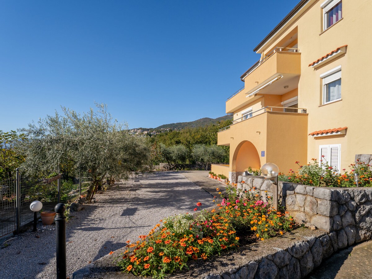 L'appartamento si trova vicino al centro di Abbazia, a pochi minuti di auto o a otto minuti a piedi. Si compone di un soggiorno, una camera da letto, una sala da pranzo, due bagni, una cucina, una sauna, un salotto open space, una terrazza, un giardino circostante e un parcheggio. Grazie al fatto di essere al piano terra con un giardino circostante si ha la sensazione di affittare una casa e non un appartamento.