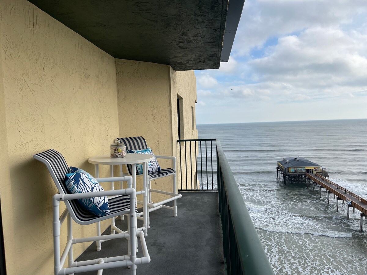 This bright, breezy seaside studio features a private balcony with a stunning direct oceanfront view from the room and balcony. This studio is ideal for families or up to 4 guests with included bedding (2 queen beds). This beach unit is part of the Daytona Resort and Conference Center building. This building has been recovering from previous hurricane damages. The indoor pool and north side outdoor pool just reopened for use. Enjoy both pool view and ocean view directly from the room.