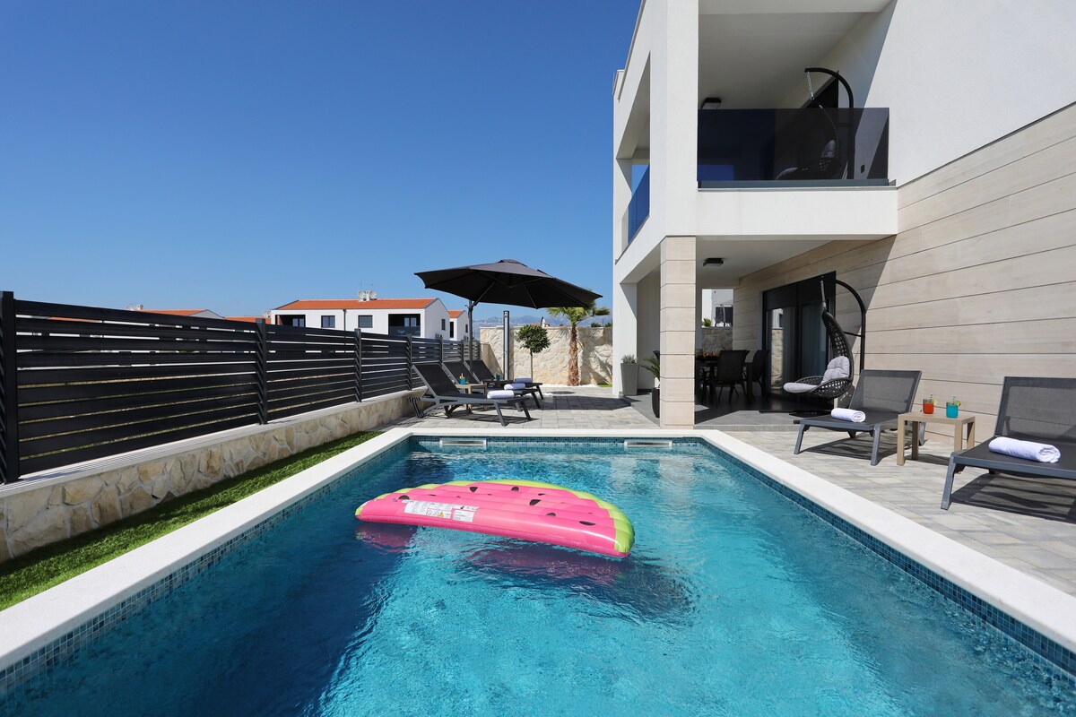 Questa villa nuova di zecca si trova in una posizione tranquilla vicino alla spiaggia, a ristoranti e a supermercati. La casa è composta da tre camere da letto, soggiorno con sala da pranzo, cucina completamente attrezzata, tre bagni, terrazza sul tetto, piscina privata e parcheggio. Tutte le camere sono dotate di aria condizionata e una camera ha il bagno privato. I nostri ospiti hanno a disposizione un parcheggio gratuito e un barbecue. Tutti i contenuti sono privati. La nostra famiglia ti augura un piacevole soggiorno.