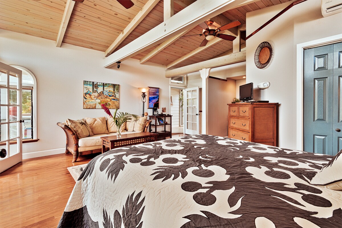 Questa casa è ovviamente unica ed è stata persino presentata su HGTV's Off Beat American & The Travel Channel, ma è il terreno stesso di cui ci siamo innamorati. Questa casa interamente in cemento si affaccia sull'oceano ed è arroccata su una scogliera lavica a Kehena Point. Il punto si protende nell'oceano oltre le scogliere laviche circostanti e offre una vista impareggiabile sulla costa in entrambe le direzioni. Osserva le balene in stagione (da novembre ad aprile) e raggiungi a piedi una spiaggia di sabbia nera.