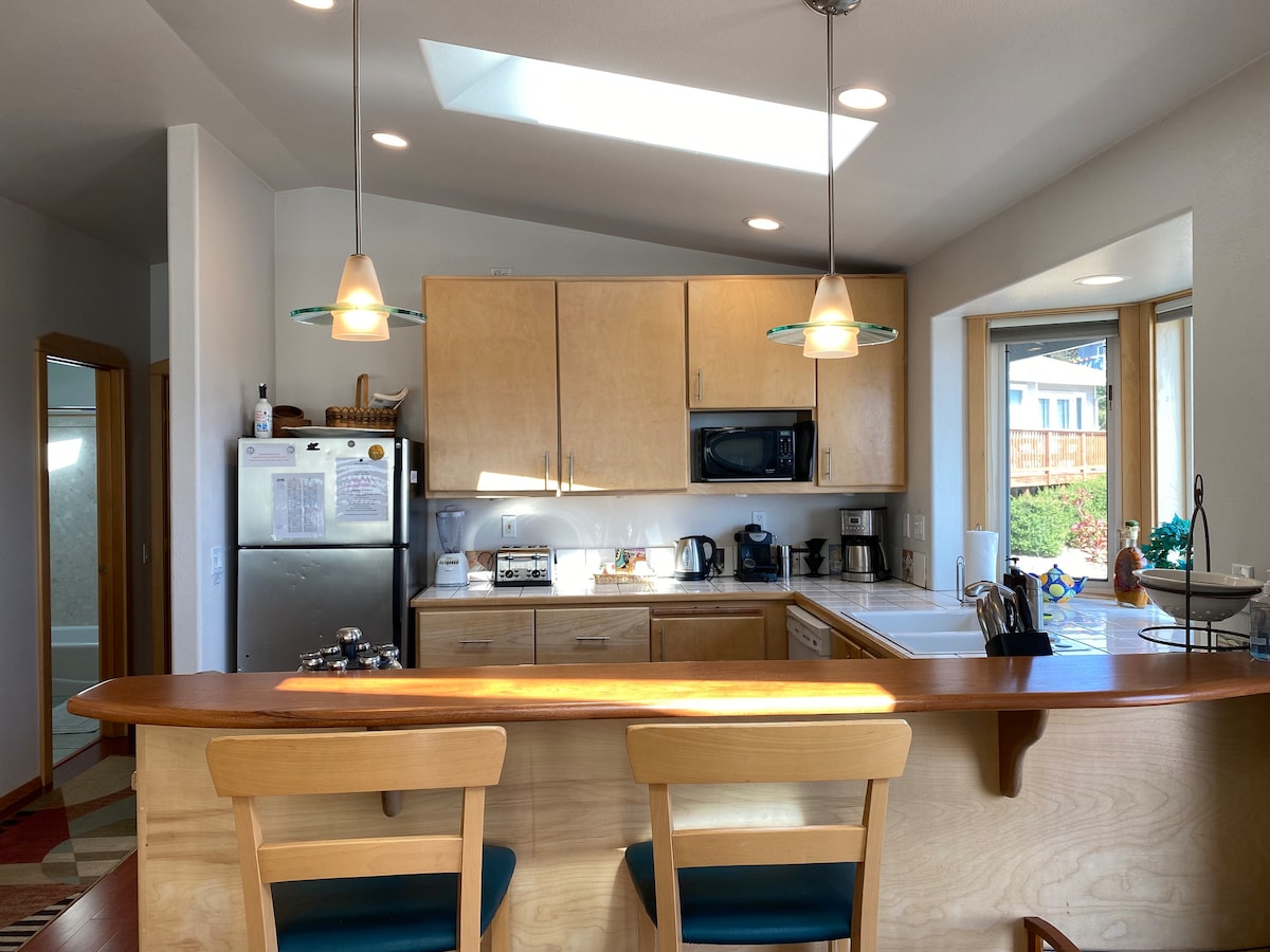 Abbiamo recentemente rinnovato la camera degli ospiti, sostituendo i vecchi letti estraibili con un nuovissimo letto matrimoniale e una TV a schermo piatto. Il nostro piccolo angolo di paradiso si trova a 2 isolati da una delle spiagge più belle dell'Oregon. Le visite estive includono l'accesso opzionale al Bayshore Clubhouse (a pagamento) con piscina riscaldata, sala ricreativa e altro ancora. 1 letto king-size, 1 letto queen-size, piccolo futon matrimoniale, 2 bagni, grande vasca con vista sull'oceano, TV satellitare, Wi-Fi, lettore Blu-ray. Cucina completamente attrezzata, barbecue e stufa a legna.