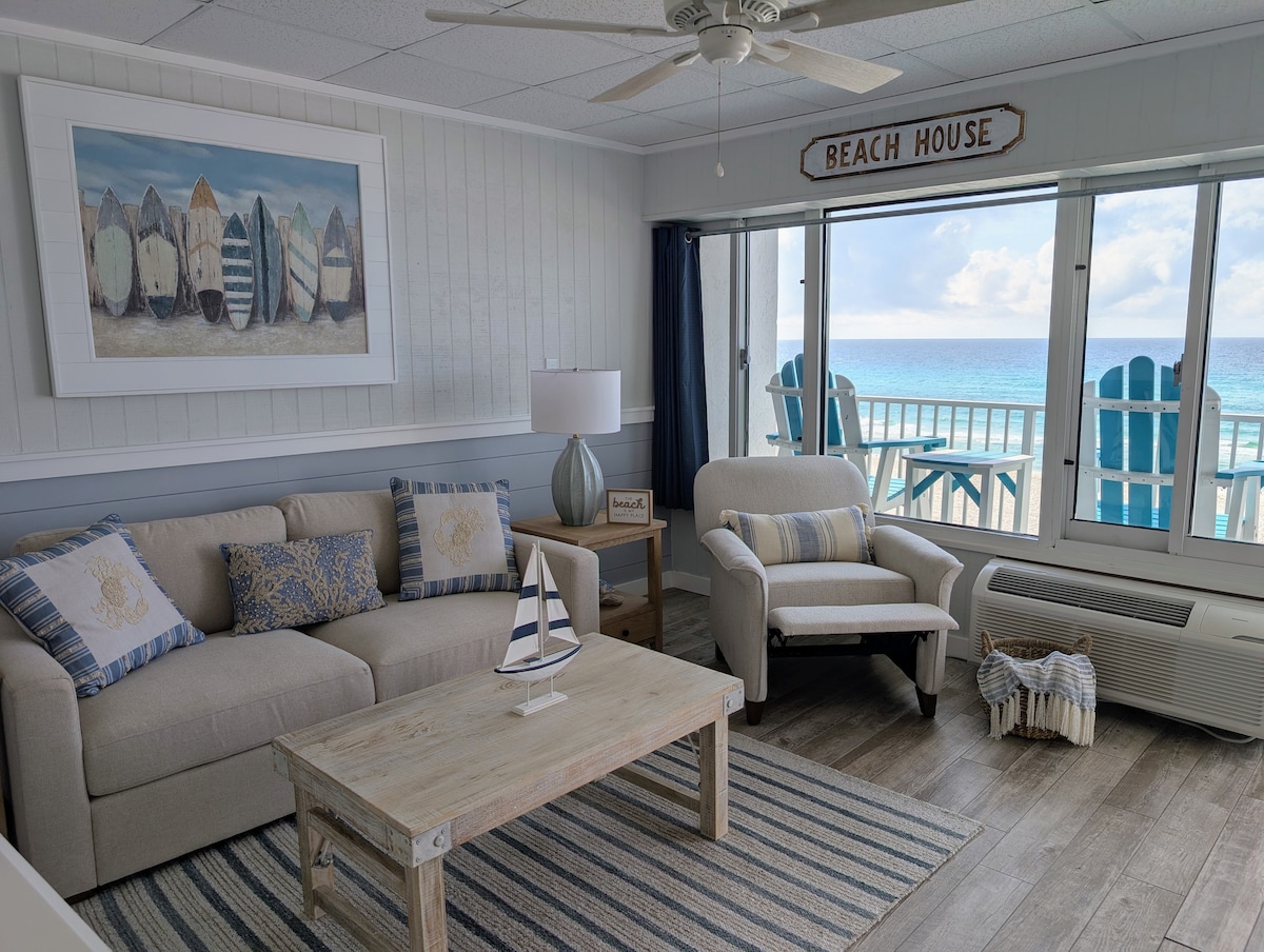 WELCOME TO PARADISE!! Come and relax at this recently renovated beachfront one bedroom hideaway. FREE BEACH CHAIRS/UMBRELLA🏖️ included with the reservation (March 15-October 31). This property is located on the 4th floor right on the beach in beautiful PCB!! This unit has a king bed, a full-size couch, and a recliner. It has a full kitchen and a private balcony. It's within walking distance to Pier Park and many restaurants. It also has a Beachside Cafe and seasonally heated pool on property!