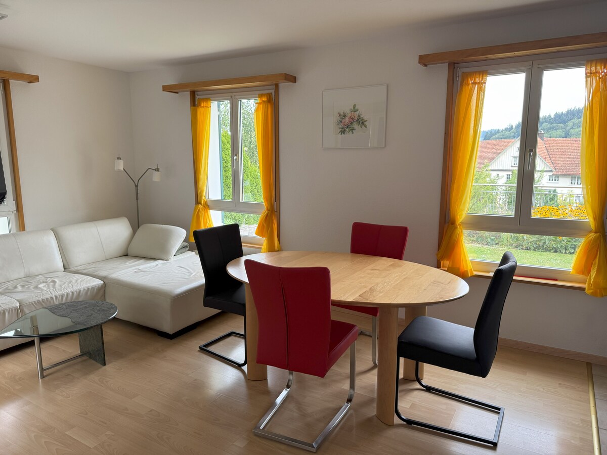 Soleggiato appartamento con 2 camere da letto con ingresso indipendente e posto a sedere in casa indipendente con vista sul Säntis. Zona rurale collinare ideale per escursioni a piedi e in bicicletta. Negozio aperto 24 ore su 24, 7 giorni su 7, nel villaggio. La città di Wil (tratta Zurigo-St. Gallen) con i mezzi pubblici è a 20 minuti di distanza. L'appartamento si trova a 5 minuti dalla stazione degli autobus. Cucina completamente attrezzata, soggiorno con grande divano in pelle. Lavatrice, asciugatrice da concordare in comune. Parcheggio incluso.