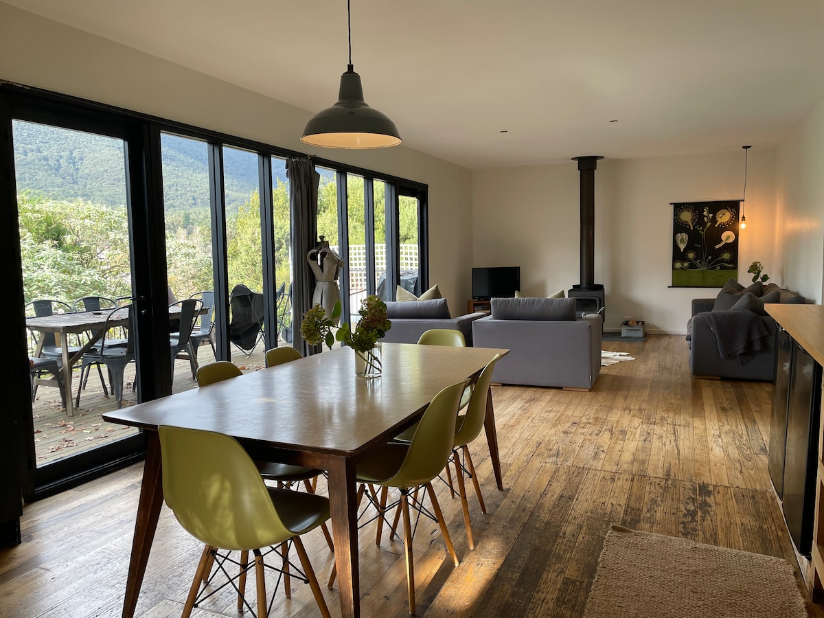 Con viste mozzafiato sul Monte Victoria, questa casa degli anni '50 è stata restaurata con cura e modernizzata in uno spazio a pianta aperta e luminoso. A pochi minuti a piedi dalla strada principale di Warburton, puoi passeggiare in città o semplicemente sederti sull'ampio ponte e ascoltare il canto degli uccelli sugli alberi circostanti. Una cucina a pianta aperta con elettrodomestici tedeschi, una stufa a legna per notti accoglienti e un letto matrimoniale grande per osservare le numerose formazioni di nuvole che si spostano rendono questa vacanza indimenticabile.