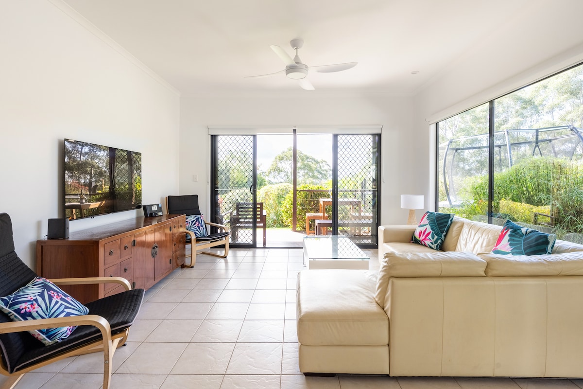 4 Bedroom tropical country pool house set on acreage in a quiet valley with easy access to all the areas sights and delights. 12 mins to Ballina. 20 minutes to Lennox/Bangalow/Lismore. 30 mins to Byron/Mullum/Bruns. Spacious and private entertainer with pool, outside undercover entertaining space, large open-plan living and all kingsize bedrooms. Perfect relaxed hangout spot be it a couple, a small family or group of friends. Lush tropical gardens overlooking a beautiful quiet valley.