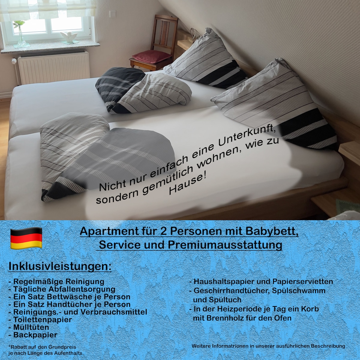 Divertiti con tutta la famiglia in questo alloggio elegante. L'alloggio ha un'ottima dotazione e molti extra. Per sognare si arriva in un letto a molle con 180x200 cm, e si può decidere in bagno se si desidera fare il bagno comodamente nella vasca da bagno 190x90 cm, con doccia a pioggia o piccolo soffione doccia idromassaggio. Per un bambino o una terza persona c'è anche una camera per gli ospiti, che può essere utilizzata anche come studio. Puoi cucinare in cucina.