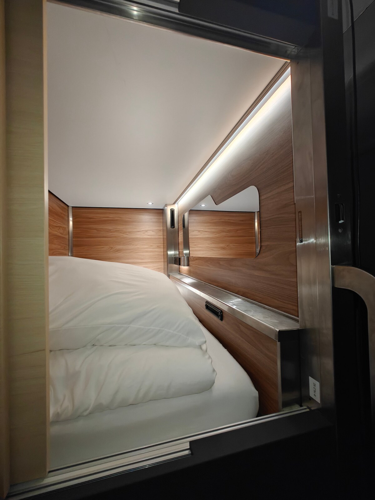 L'illuminazione blu e le finiture minimaliste creano un aspetto elegante e un'atmosfera tranquilla in questa cuccetta con controlli individuali della capsula.