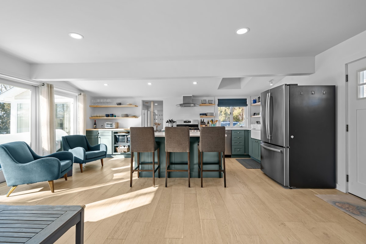 Questo spazio tranquillo in posizione centrale è un cottage moderno, soleggiato e spazioso con una camera da letto, situato nel cuore della storica Wakefield. Siamo a pochi minuti da molte spiagge del Rhode Island. Passeggia in discesa fino a un grazioso parco sul fiume Saugatucket, poi attraversa l'affascinante passerella per raggiungere la città. Qui troverai una varietà di ristoranti, caffetterie e gelaterie, oltre a un eccellente teatro comunitario, yoga e negozi interessanti. Rilassati all'interno di questa casa piena di luce o siediti sul ponte con vista sui giardini e sulla città.