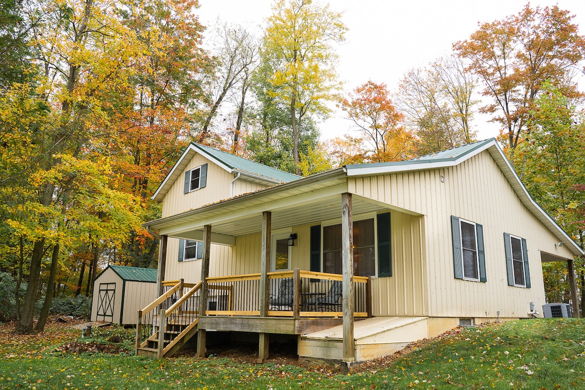 Un pittoresco e accogliente chalet recentemente ristrutturato nel 2025 su 60 ettari boscosi, perfetto per una vacanza di coppia. A 8 minuti da un fantastico centro per lo shopping di boutique uniche, ristoranti, cantine locali, birrifici e distillerie! Goditi la pace e la tranquillità nella natura. Accogliente fino a un enorme caminetto a legna in pietra sia all'interno che sul portico schermato. La nuovissima vasca idromassaggio privata vanta acqua di sorgente naturale, si trova appena fuori dalla porta della baita e si affaccia sugli stagni primaverili naturali.