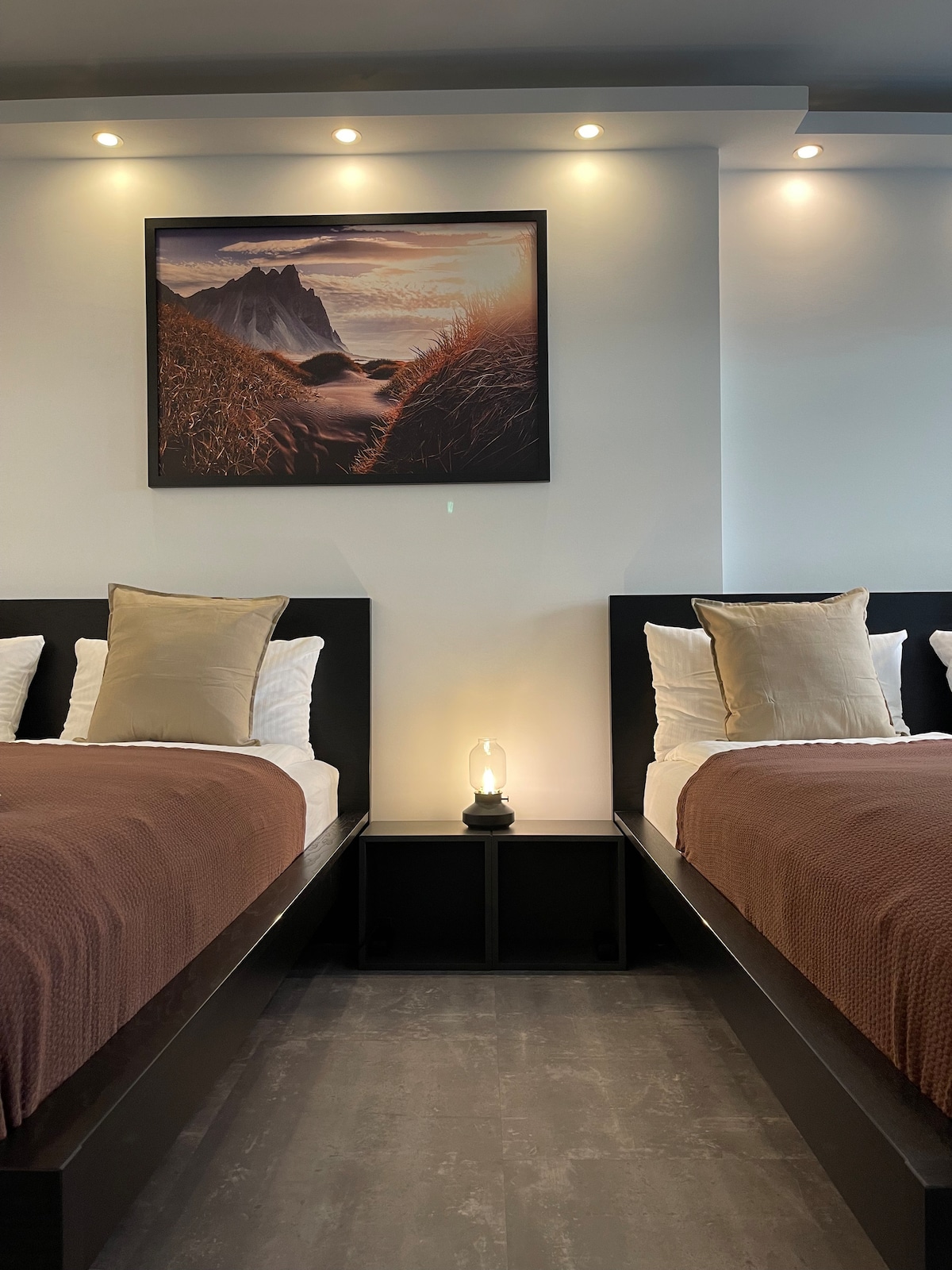 L'appartamento con due camere da letto ha una superficie totale di 59m² e comprende 2 bagni (doccia/vasca con asciugacapelli professionale e cosmetico), un soggiorno con divano letto e TV, una camera da letto matrimoniale con TV e una camera singola. Dispone inoltre di ampio spazio per armadietti, una cucina completamente attrezzata con lavastoviglie, lavatrice e macchina del caffè, tavolo da pranzo. Può ospitare fino a 3 adulti e un bambino/neonato (un bambino fino a 9 anni su un divano letto e/o un neonato in una culla in più).