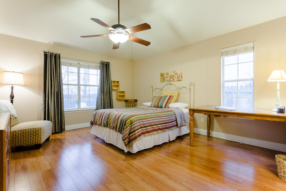 Casa recentemente ristrutturata in una tranquilla strada senza uscita a un minuto dall'autostrada 183 e a diciannove minuti dal centro. Entrambe le camere da letto sono spaziose e dotate di bagno privato e cabina armadio. La camera da letto principale ha un letto California King e la seconda camera da letto ha un letto Queen. Entrambe le camere da letto sono al piano di sopra. Abbiamo installato un corrimano e delle maniglie antiscivolo sui gradini, ma se le scale sono un problema per alcuni ospiti, abbiamo un letto a rotelle riposto in garage e un grande divano che può essere utilizzato al piano di sotto.