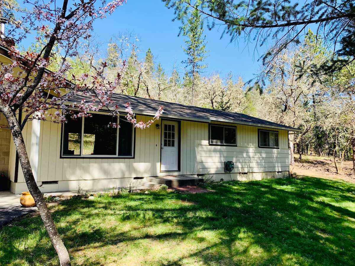Foresta appartata di 5 acri a soli 3,5 km da Grants Pass con un sentiero privato per le leggendarie Cathedral Hills. Una casa 3/2 con Wifi DSL, zona pranzo, soggiorno, stufa a pellet, un divertente posto auto coperto convertito per mangiare/intrattenimento/barbecue e una vasca idromassaggio sul retro. La proprietà dispone di un torrente e di uno stagno stagionali, a 90 metri dalla casa, e di un classico fortino sull'albero. Goditi pasti all'aperto, escursioni a piedi o in bicicletta, o rilassati nei tranquilli boschi dell'Oregon meridionale. Siamo amici degli animali domestici, richiediamo un supplemento di 30 $ per animale domestico e limitiamo a 2