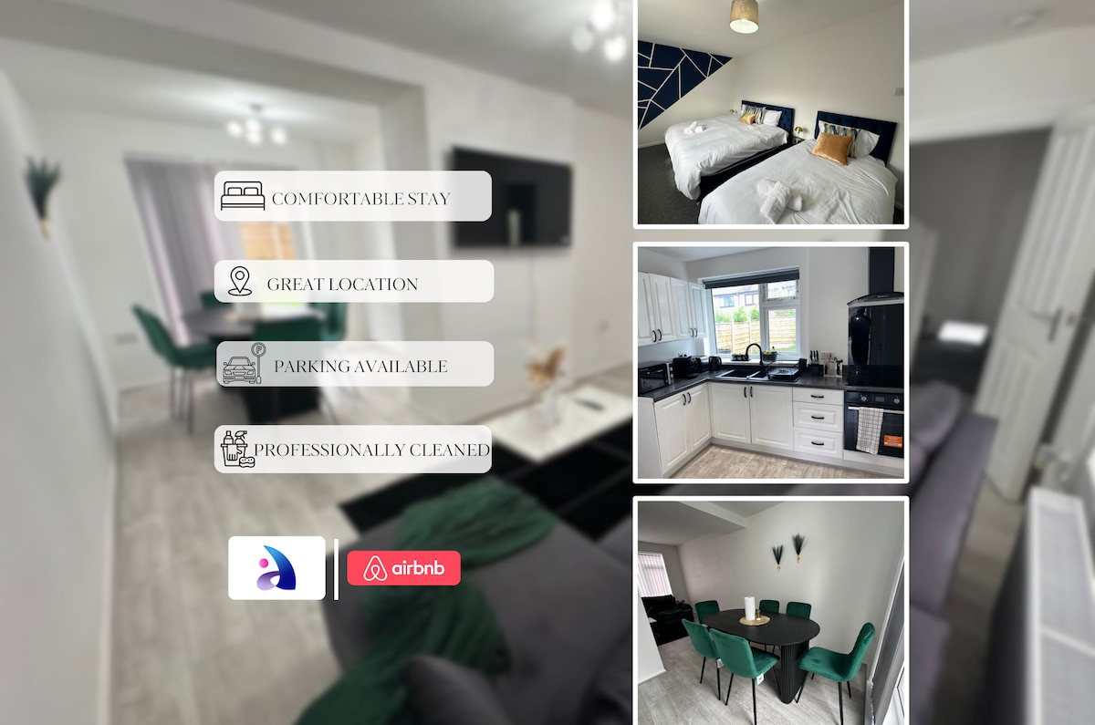 Welcome to our cozy and stylish two floors flat perfect for families, couples, or friends looking for a comfortable stay. Located just 5minutes by car from the Manchester Airport. First floor well-furnished bedroom with superking-sized bed and plenty of natural light. Smart TV and high speed Wi-Fi. Ground floor Modern kitchen with all appliances and a dining area for 4 people. Free parking available on the premises. Feel free to message with any questions. We look forward to hosting you!