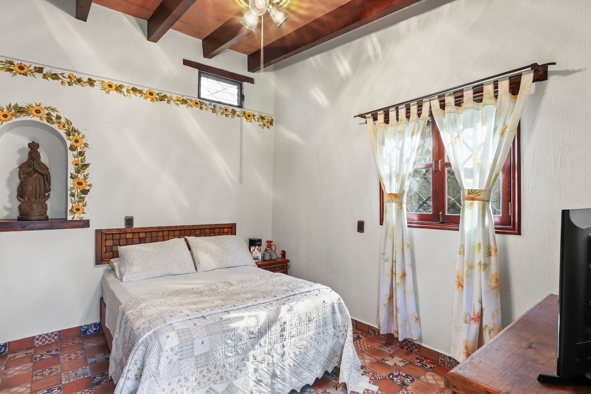 Questa graziosa camera è costruita in adobe, che le conferisce un'atmosfera rustica e accogliente. Il pavimento di fango, combinato con i dettagli a mosaico di talavera in bagno, crea un'atmosfera calda e autentica. Le querce di legno appuntate aggiungono un carattere vintage e pieno di carattere, mentre le tende dipinte a mano adornano le pareti, riflettendo la tradizione e l'arte locali. Uno spazio perfetto per chi cerca un'esperienza unica e genuina.