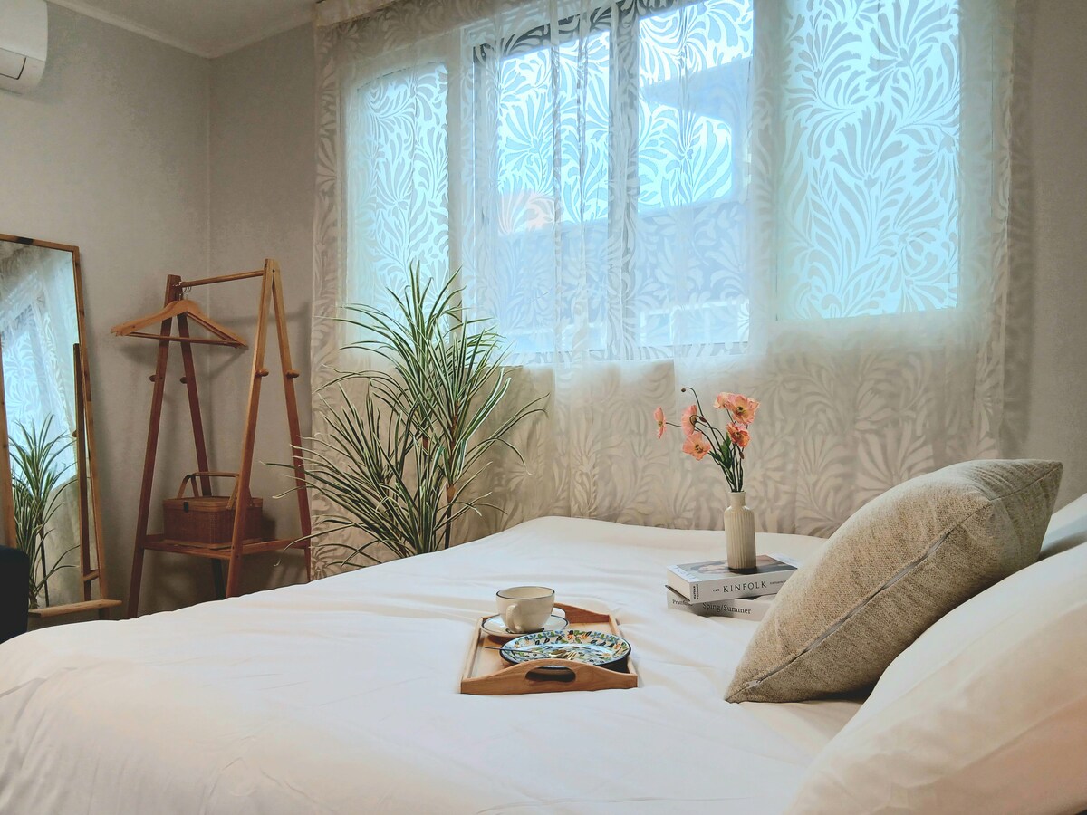 Vivi l'atmosfera serena e accogliente di Under Cloud, una spaziosa casa di 50 m² con due affascinanti camere da letto, soggiorno in mattoni, bella cucina e bagno, ripostiglio extra e un accogliente balcone + amaca. In una zona tranquilla ma comoda, offre un facile accesso ai migliori luoghi di Seoul e all'aeroporto. Clicca su "Mostra altro". ☛ A piedi Hongdae: 15 min | Hapjeong Stn.(Linea 2/6): 8 min | 2 centri commerciali: 5 min ☛ In autobus/metro Aeroporto di Incheon: 50 min | Antichi palazzi: 30-40 min | Myeong-dong: 30 min | Gangnam: 40 min